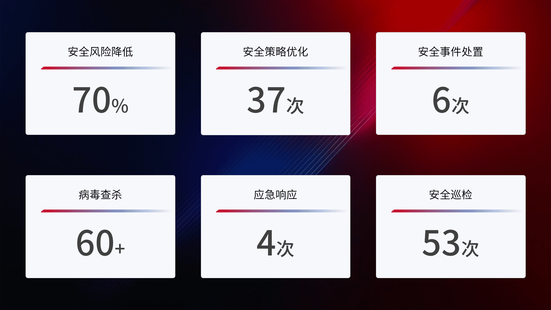 提供全面的安全事件报告体系,,,,包括处置报告、、周报、、、季度和年度总结,,结合持续监控,,,帮助客户深入了解网络安全状况。。