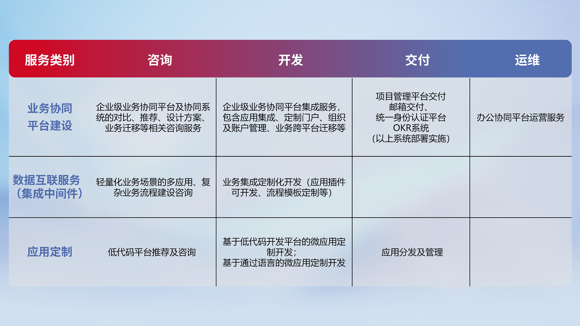 针对钉钉、、企微、、、、IDaas等平台级产品提供产品的规划、、方案、、交付、、定制化开发等服务,,,实现如统一协同办公、、智能客户服务、、、混合会议管理、、、智能数据查询、、、等业务场景,,,实现数字化转型。。。