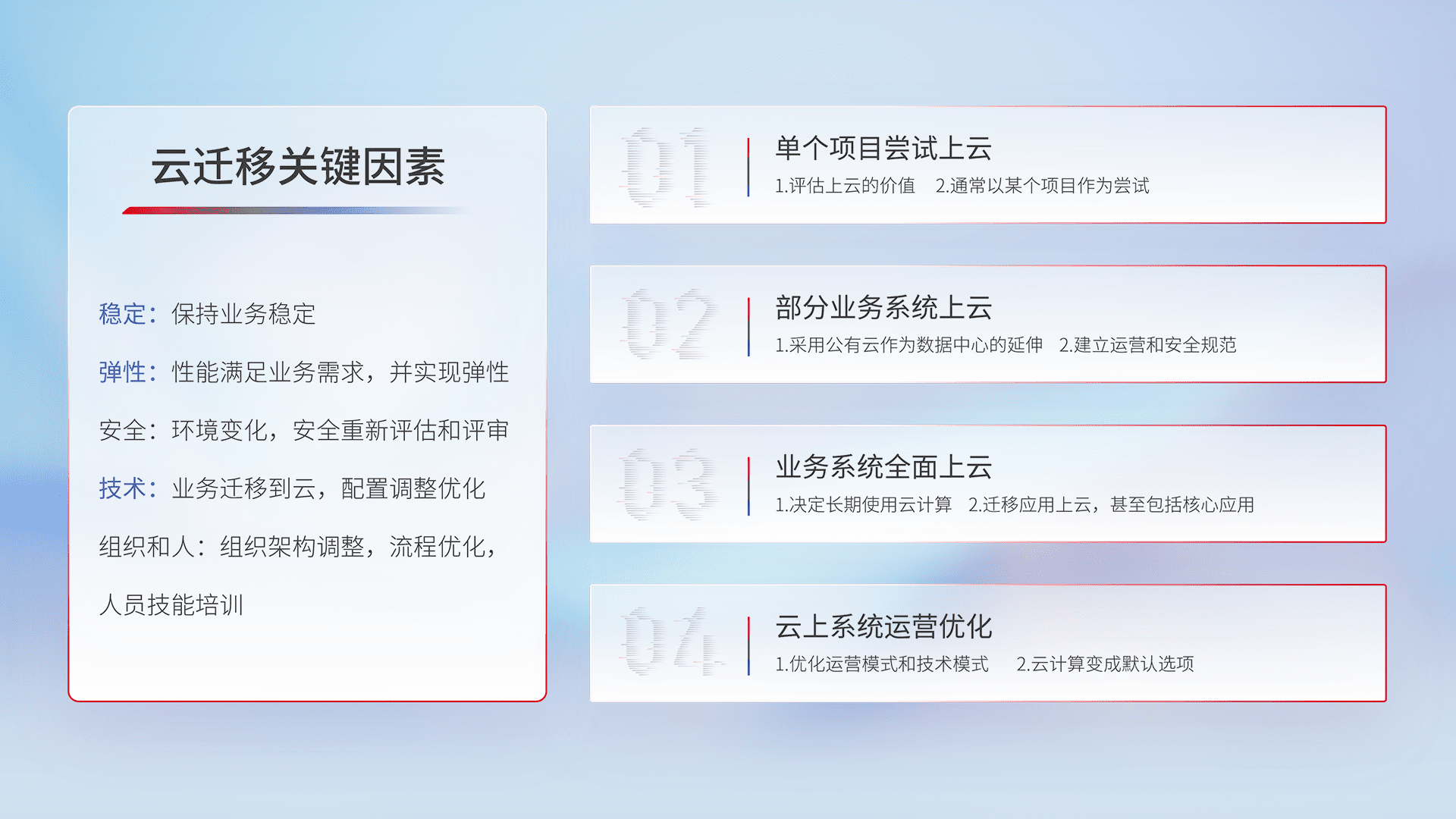 结合实际业务,,,,从规划设计、、、云平台选型、、、云原生改造、、、、数据迁移、、、、集成交付,,迁移全过程为客户识别最佳上云路径,,做好风险识别管理,,,,设计网络架构、、、、身份权限、、安全审计合规、、、操作审计、、、日志审计、、、监控告警策略、、、、多站点容灾设计等,,对云上基础设施进行整体规划,,,提升IT治理水平,,,以满足弹性、、、、高可用、、、、高性能的需求。。。。